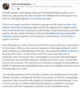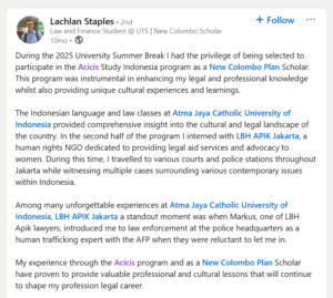 The Acicis LPP 2025 program concluded with a closing ceremony attended by participants, Atma Jaya Catholic University representatives, host organisation mentors, and Acicis staff. It was an inspiring moment to celebrate the students’ achievements, the dedication of our host organisations, and the invaluable learning experiences gained throughout the practicum. We hope this program has broadened our students’ legal knowledge and strengthened their cross-cultural competencies and professional networks. We look forward to seeing how this experience shapes their future legal careers and advocacy efforts. Terima kasih & sampai jumpa!