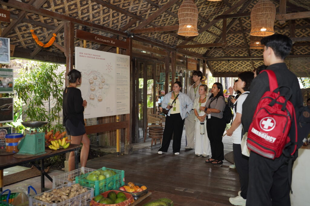 Students also visited Mana Earthly Paradise, an eco resort located in Ubud, Bali. Mana operates based on regenerative and environmentally friendly principles. The resort offers accommodation without air conditioning (using fans instead), an organic restaurant, an ecofriendly marketplace, and educational programs centred on nature and sustainable living. Through a discussion and Q&A session, students gained valuable insights into the management and operation of eco resorts and sustainable hospitality businesses.